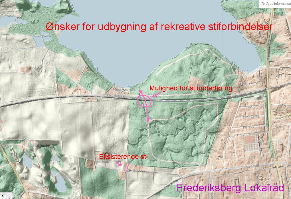 Ønsker man i dag at komme fra Frederiksberg til Sorø sø, er dette kun muligt ved at følge Skælskørvej og derpå dreje ind i skoven ad Feldskovvej. Tidligere kunne man med forsigtighed passere banelegemet, ja, man kunne høre togene! I dag er dette livsfarligt og resterne af påkørte dyr taler deres tydelige sprog; derfor vil Frederiksberg Lokalråd arbejde på at få etableret en tunnel fra Rundskoven under banen. Dette må ske i samarbejde med Sorø Kommune, Sorø Akademis Skovdistrikt og Banedanmark.